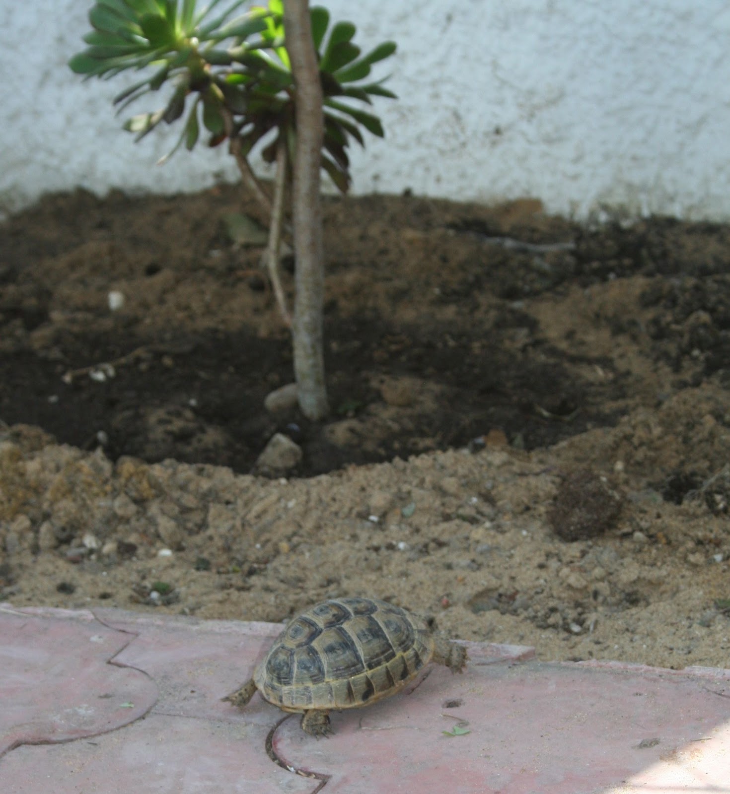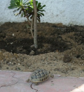 So at the market yesterday, we bought three more Tunisian spur-thighed tortoises, one male and two females. I can’t believe the personalities they exhibit and they are so active. The adolescent male barely had his feet on the ground before he was shell ramming our granddad tortoise like an elk during mating season. We finally thought it might be too traumatic for our old-timer and removed the newbie, but this morning, we saw our old tortoise facing off the young one as he slunk away so I think they’ve somehow got their hierarchy established.