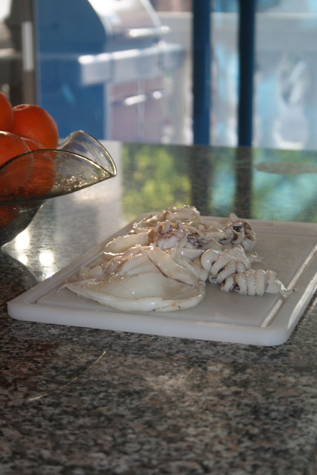 More than one site recommended marinating the squid in milk to soften it. All I can think of is lactic acid in milk that could work on the fibers of the squid. The advice was to marinate it for 24 hours, but we had about 6 hours so we tried it. We left it in big chunks and tentacles, covered it with milk, stirred in a couple of cloves of sliced garlic, salt, and pepper, and put it in the refrigerator.