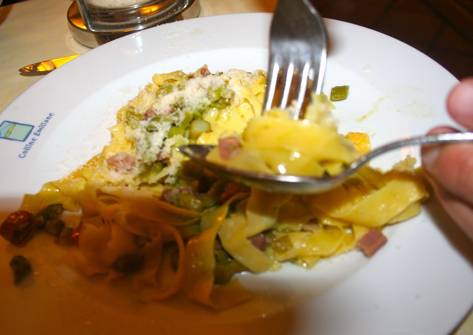 Next, came the real pasta we had ordered, tagliatelli with ham and asparagus. Again, it wasn’t thick ropes of noodles, but almost transparent strips that at moments made me think of eating Asian rice noodles.