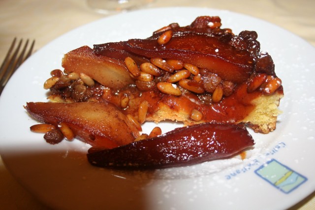 Dessert isn’t always my favorite part of the meal and I don’t often even have dessert, but their freshly made sweets were on display as you entered the restaurant and in fact, to order one, you had to get out of your chair and go point to the one you wanted. You knew that when an item was all served up, that was it for that day. I got the first serving of the pear tarte tatin with pine nuts and currants.