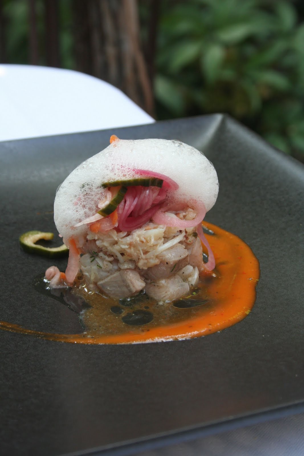 The first course was a timbale of crab and trout, topped with lightly pickled vegetables and finished with a foam of some delicious sort.  With this they paired the darkish Rodenbach.  This beer went with the dish so similarly to wine.  It had a dark sweetness but then finished with a little citrus and bitterness.