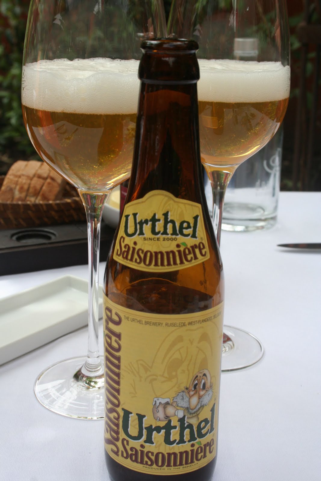 The main course was a white fish, a potato mash, and roasted fennel.  I want to just point out here that most of the vegetables I have seen on this trip have been white:  white asparagus, endive, leeks, and now, fennel.  Anyway, white or not, it was an exquisite combination of flavors.  With this, they paired the slightly comic looking Urthel Saissoniere.  This blond beer was spicy and matched up to the fennel, which is a strong flavor.