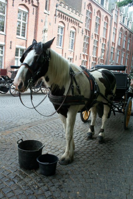 Both cities have alternative transportation to motorized vehicles.  In Venice, it’s the foot and water taxis.  In Brugges, it’s bicycles and Belgian horses.  There must actually be a city ordinance allowing horses the right of way because the few cars we saw in the city came to a screeching halt if a Belgian-drawn carriage entered an intersection at the same time as a car.