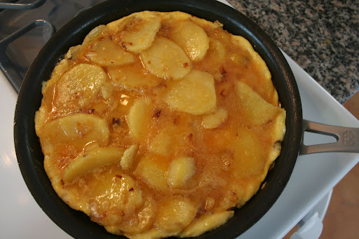 6. Wipe the pan with a paper towel, return to the heat, add another tablespoon of the reserved olive oil and carefully slip the tortilla back into the pan. Using a rubber spatula, carefully tuck the edges of the tortilla back into the pan and cook for another 3 minutes. Once the bottom is set, repeat the flipping process one or two more times until the edge of the tortilla is perfectly rounded. If at any time the tortilla begins to swell, poke it gently with a fork. The tortilla should be nice and golden on the outside while remaining creamy and gooey on the inside. Remove from the pan and serve hot or at room temperature.