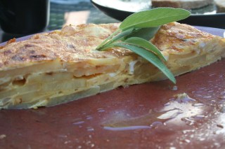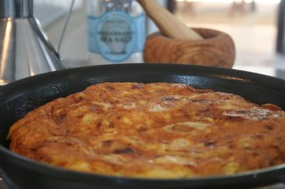 Today, it was ready, but we needed a salsa vehicle. I had just been catching up on some Tasting Table postings and one was for a classic Spanish tortilla, which if you know Spanish food isn’t a flat bread, but a layered dish of potatoes and onions, held together with eggs, and almost simmered in olive oil. The commentary on this recipe emphasized that the olive oil was just about the most important ingredient and I’m hesitant to even recommend this recipe to people who don’t have access to the beautiful and inexpensive olive oil we have here on the Mediterranean. I completely understand how it can be the star of a dish.
