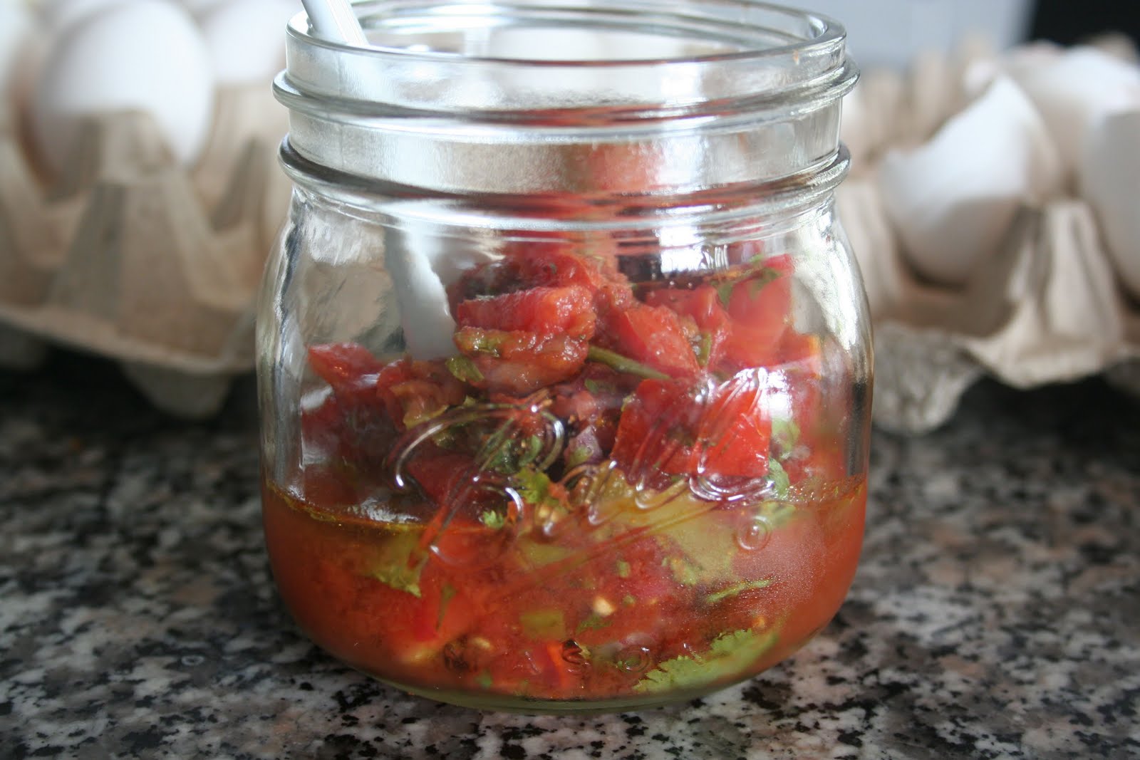 We’ve been gone to the beach so opening the fridge at home on Sunday morning, looking for the makings of brunch, revealed little except some fresh fruit, but there was a little jewel box looking container of salsa fresca made by my friend, Lauren. The stipulation was that I had to give it a few days before eating to let it develop its best flavor.