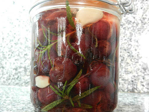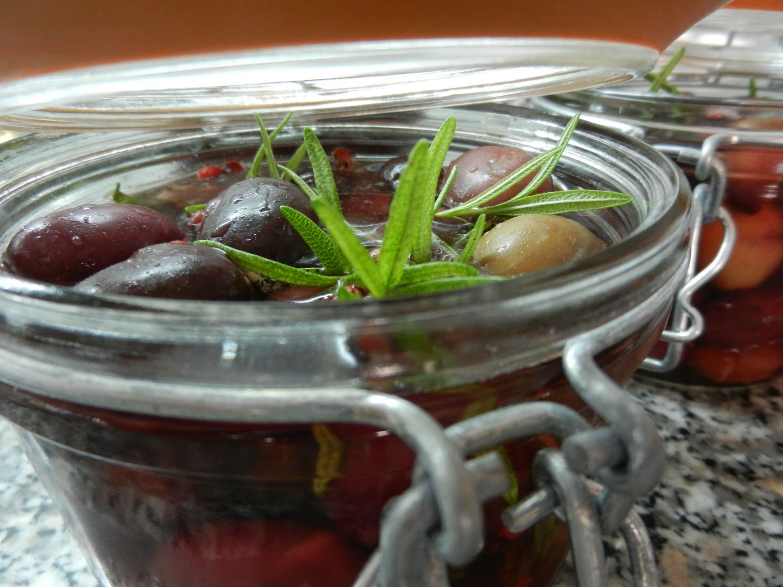 Make a solution of these ingredients and pour over olives that have been packed into sterilized containers.  It is at this point that you can also add herbs and other seasonings.  I added whole garlic cloves, cuttings of fresh rosemary, and pink peppercorns.  If lemons were ready yet, I would have added a few bits of those.  The olives can be kept, covered, in the refrigerator, for around six months.