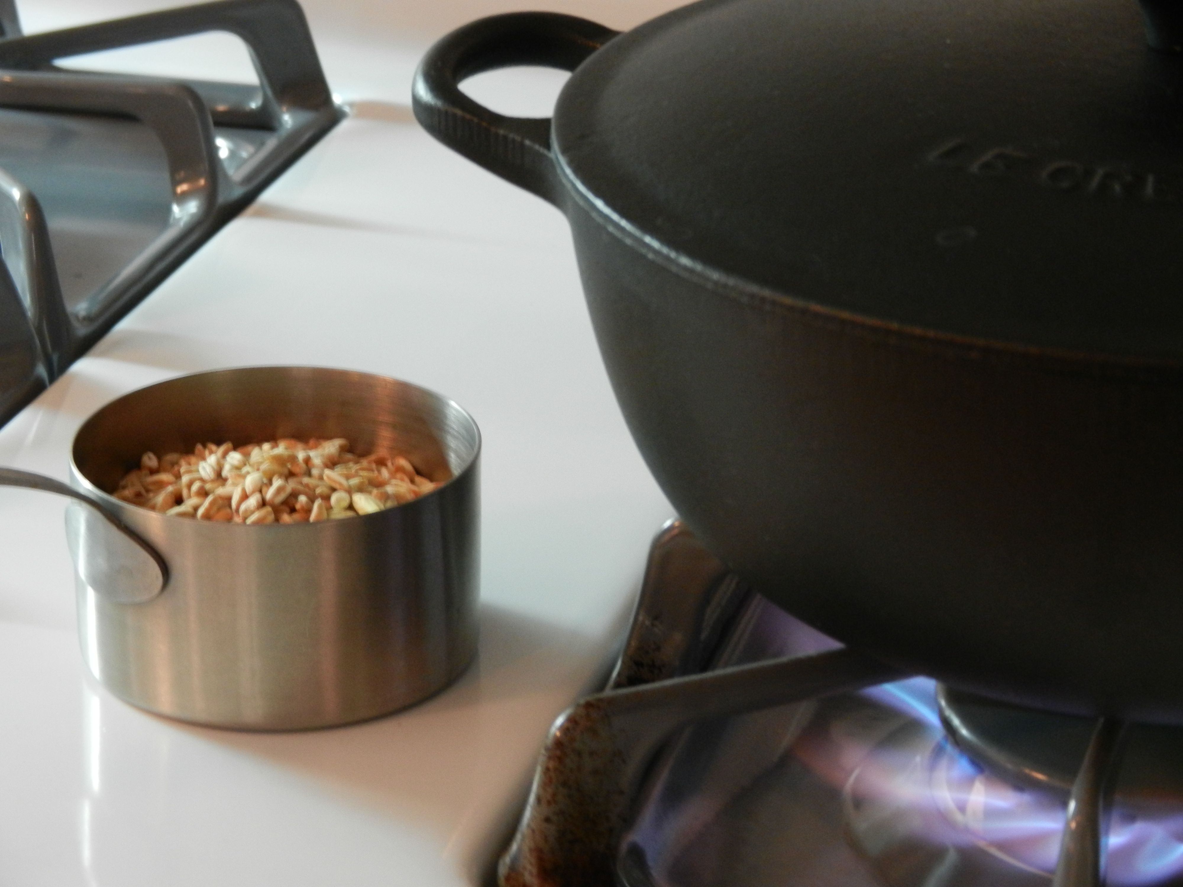 Bring a large pot of water to boil. Add farro and simmer until just tender. If using leeks, briefly steam them in a large strainer set over, but not in, the boiling water. Top with a lid. When slightly tender, set leeks aside. When tender, drain farro in a sieve, rinse under cold water, and set aside.