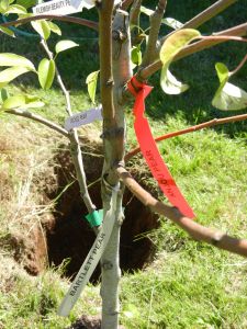 We chose several of what amount to a snack-pack of trees. Our cherry, plum, and pear trees have grafts of 5 different varieties on each tree. If you are an experienced orchardist and know this to be a poor choice of tree, please don’t tell us. We are enjoying a Garden of Eden fantasy about strolling through our tiny, fruit paradise and picking a different variety with each handful. I guess our biggest worry should be that we don’t lose the branch bearing our pollinator, though the garden shop owner couldn’t tell us which one that would be. We will just know when we never, ever get a pear.