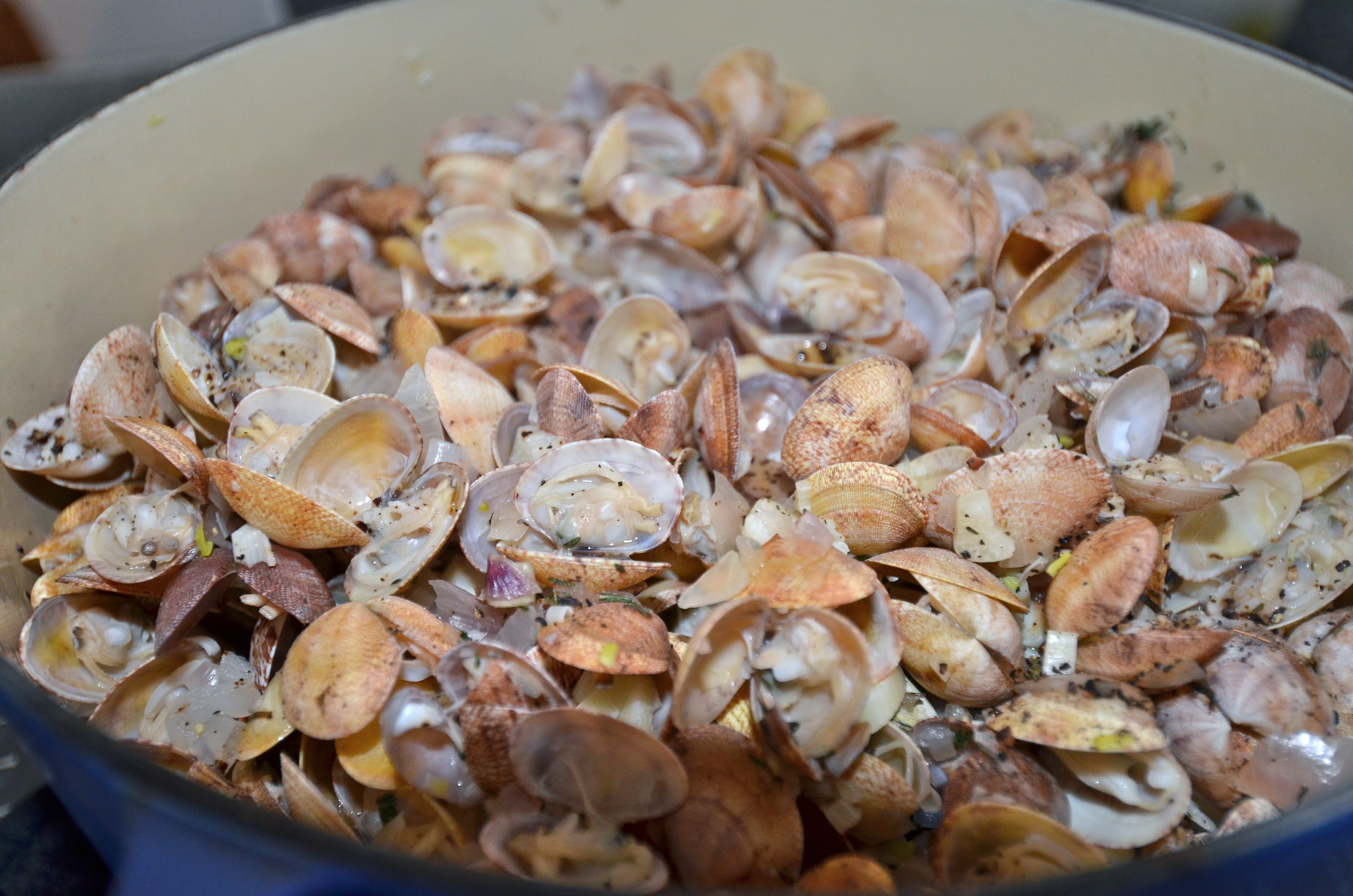 Finally, the weather turned unusually cold, with low temperatures, wind, and icy rain.  Compared to the weather in New England at the moment, this is nothing, but it did add to the unsettling atmosphere of the week.  We found some teeny, tiny Mediterranean clams at the market on Saturday called tellines.  They are so little and delicate compared to our Northwest clams.  We steamed them in the Provencal style of shallots, garlic, lemon, butter, cracked black pepper,  and a bottle of good white wine.  Picking through ladles full of these delicacies, and dipping chewy, buttered bread into the broth, calmed our nerves.