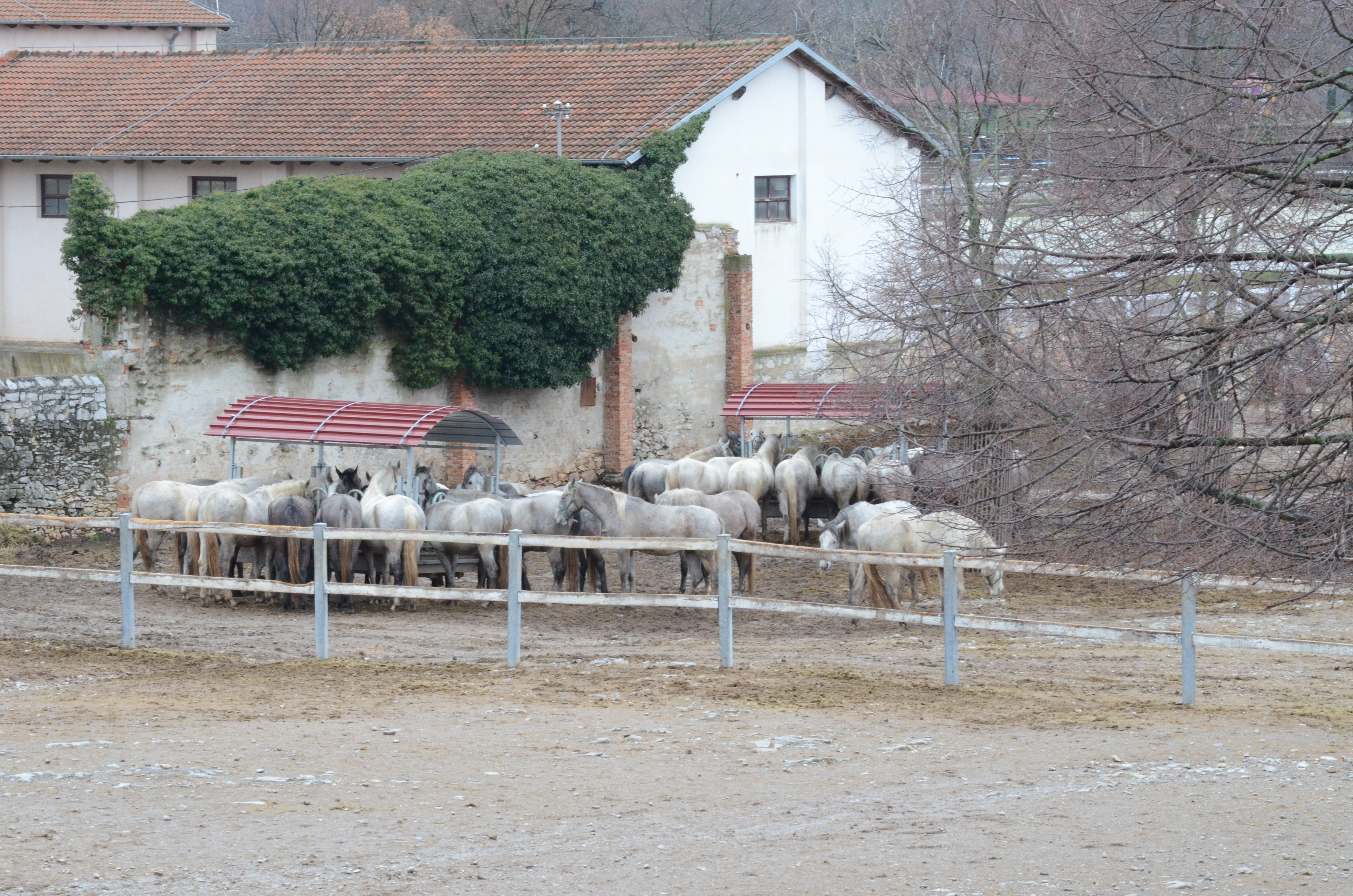 Big, wet snowflakes began to fall as we entered the village of Lipica.  Does that sound at all familiar?  It is the very place where the Lippizaner Stallions are bred and trained.  This horse breed and training style were brought from Spain to Vienna in the 16th century, but a little known fact is that the breeding ranch is in Slovenia.  Being an off time of year, the horses weren’t being shown, but we did get to visit the maternity ward where about 20 mares were waiting to give birth in the next few weeks.  The video I linked mentions a couple of facts that I was amazed by.  One is that the horses are not born white, but are genetically engineered, through exact breeding, to turn pure white at about age 8.  The other was that the idea of “breaking” a horse is grotesque to these trainers.  They are horse whisperers and in fact claim that the technique used in the movie by that name demonstrates their style.  They don’t master the horses, but calm,  befriend, and teach them.  The whole ranch exuded this air of calm.