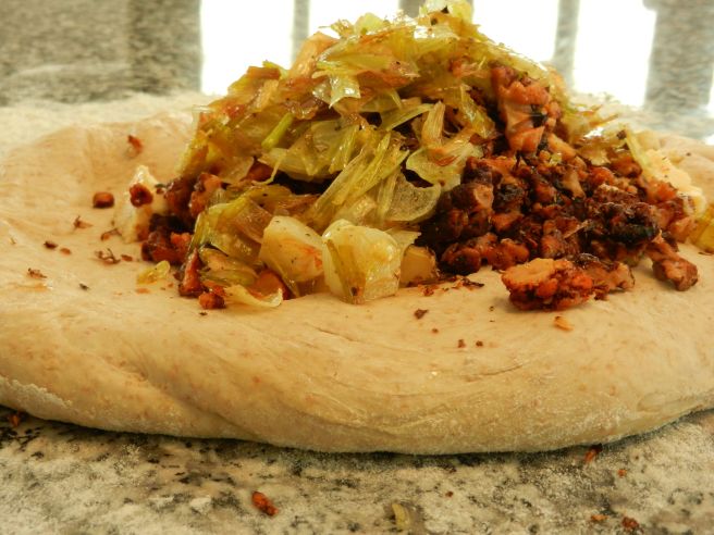 This recipe is a play on familiar spanakopita, made with spinach. Whenever I have made spanakopita in the past, I made it from a recipe-driven point of view, buying special ingredients from the grocery store and assembling them in specific amounts. Chock that up to my inexperience, but it never really occurred to me, until now, to make that pie in a free-form way. As Yotam Ottolenghi describes in his book Jerusalem, this isn’t a recipe to be made from buying little packets of herbs from the store. This is what you make when you’ve come from a true farmer’s market with unruly heads and bundles of fresh greens and herbs, or, even better, you are growing them yourself and you have so much you need ways to melt them down into savory dishes. This is additionally a good way to use up bits of delicious cheese. You pretty much can’t go wrong with the filling proportions and because the filo pastry looks all the better with rustic flourishes and scrunches, that part is worry-free, as well.