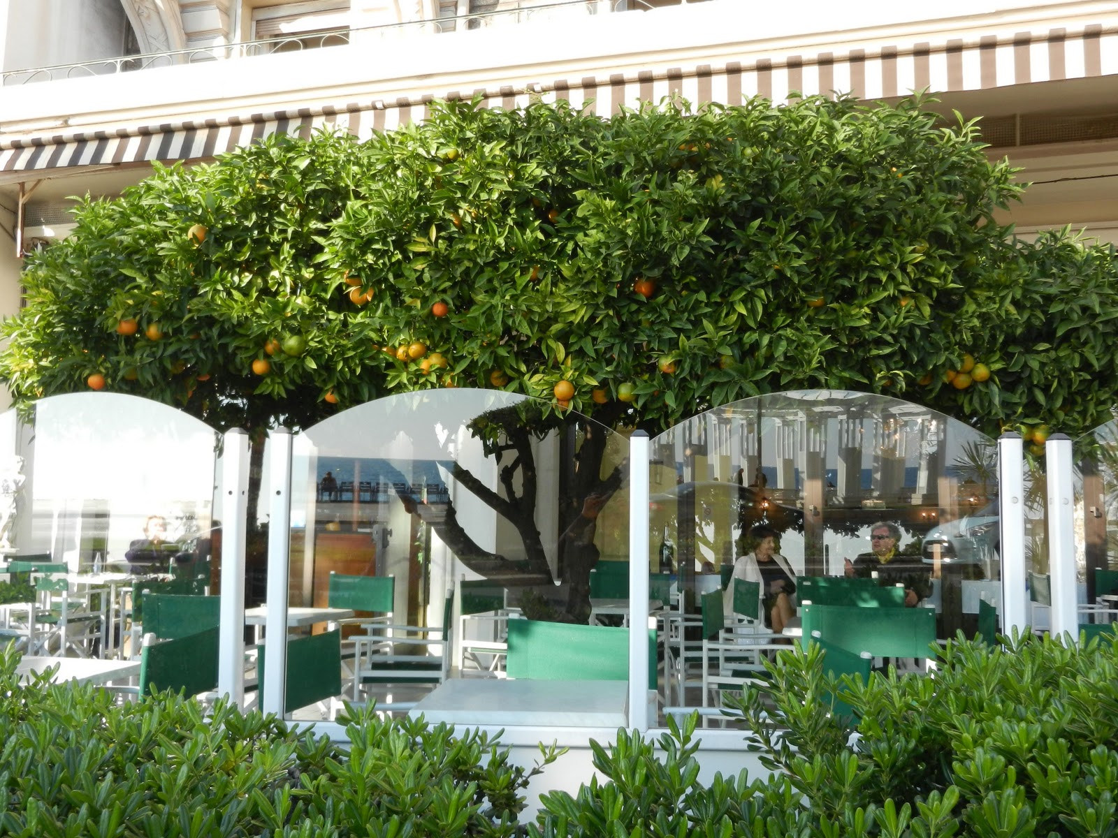 A couple having lunch under a laden, rectangular orange tree.  I know it’s anal, but I love French gardening.